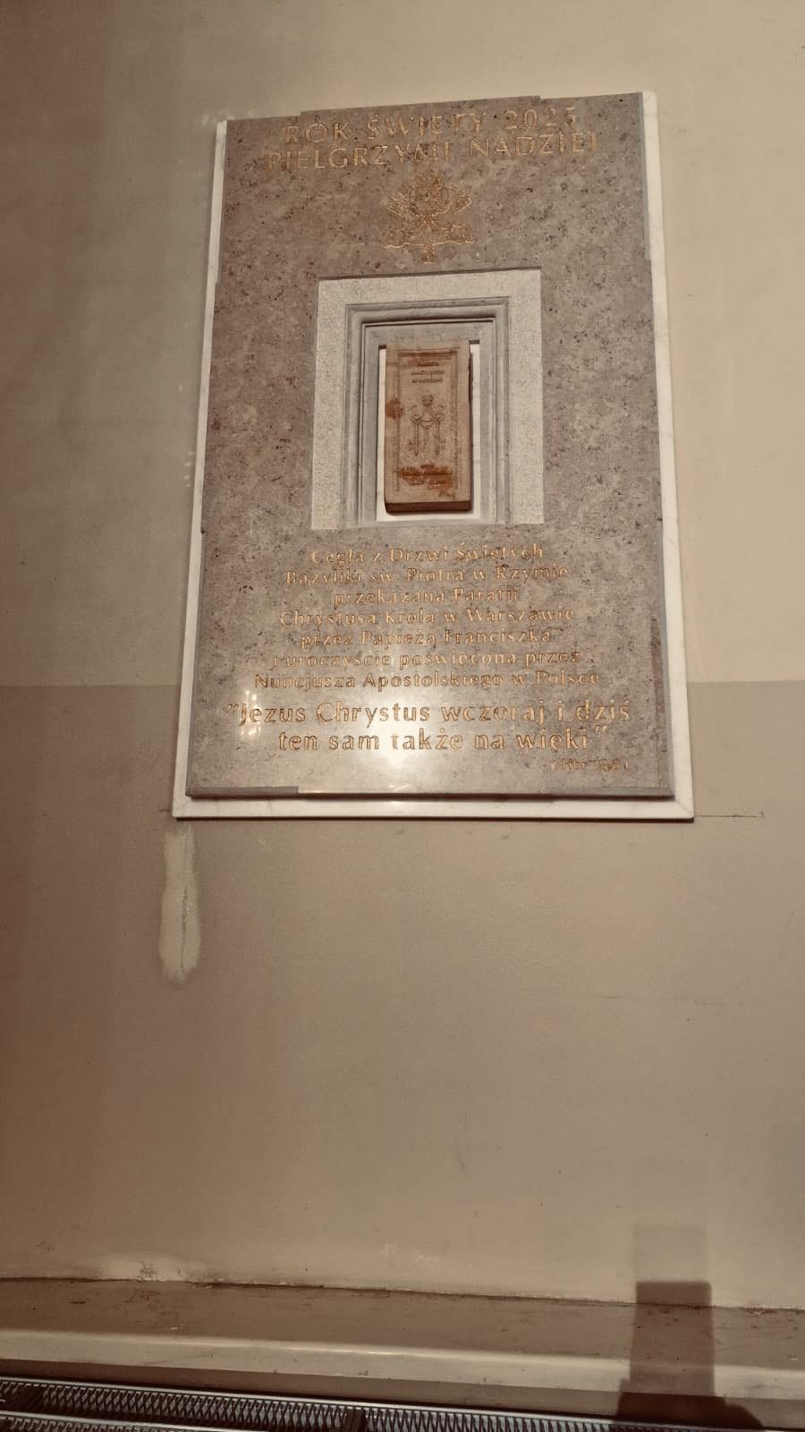 W bocznej nawie kościoła została już zamontowana pamiątkowa tablica, w której umieszczono cegłę z Drzwi Świętych Bazyliki św. Piotra – dar przekazany naszej parafii przez Ojca Świętego Franciszka. Ten fragment drzwi jubileuszowych, które otwierają tysiące pielgrzymów na łaskę i pojednanie, staje się dla nas znakiem, że również w sercu Targówka Bóg pragnie otwierać przed nami nowe przestrzenie nadziei.